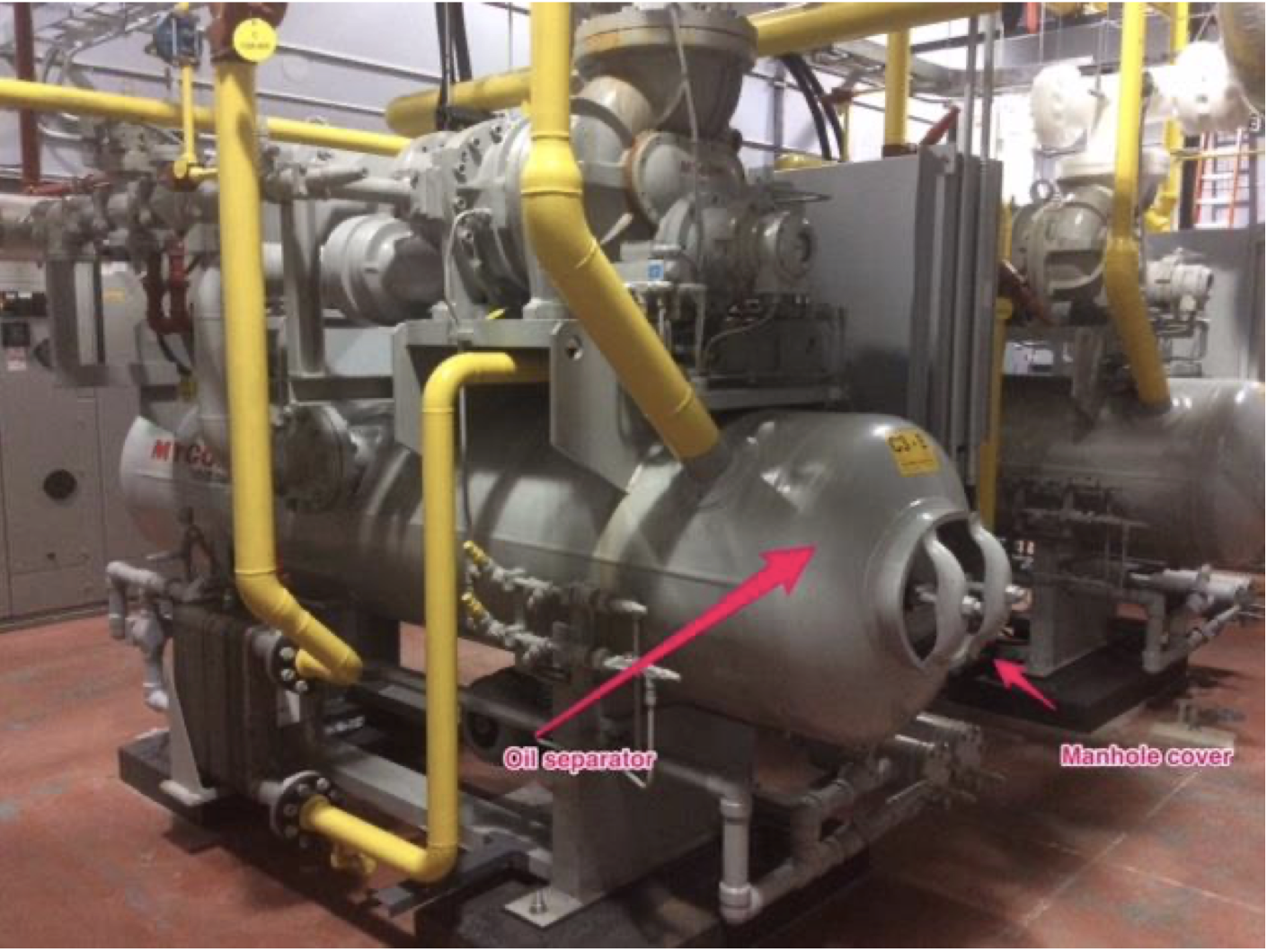 The sensors are programmed to detect an ammonia release and activate an exhaust ventilation system. The exhaust system is capable of exhausting 18 room air changes per hour. The pressure vessel (oil separator) is fitted with a manhole hatch for maintenance and inspection. A gasket is needed to provide a tight seal between the manhole cover and base metal to prevent escaping gasses from the vessel. The manhole cover is elliptical in shape and is held to the seat with two yokes and bolts.