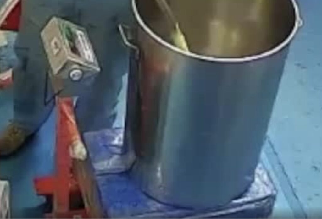 One thing that certainly played a role in this flash fire event is the fact that the METAL container is sitting on a push cart that appears to be covered in plastic wrap. These carts are usually equipped with plastic wheels. Between these two observable items, AND the fact that we can see the static looking for a “path to ground” tells me this transfer failed to provide a path to GROUND, and the rubber hose in contact with the metal container was NOT a bonding connection.
